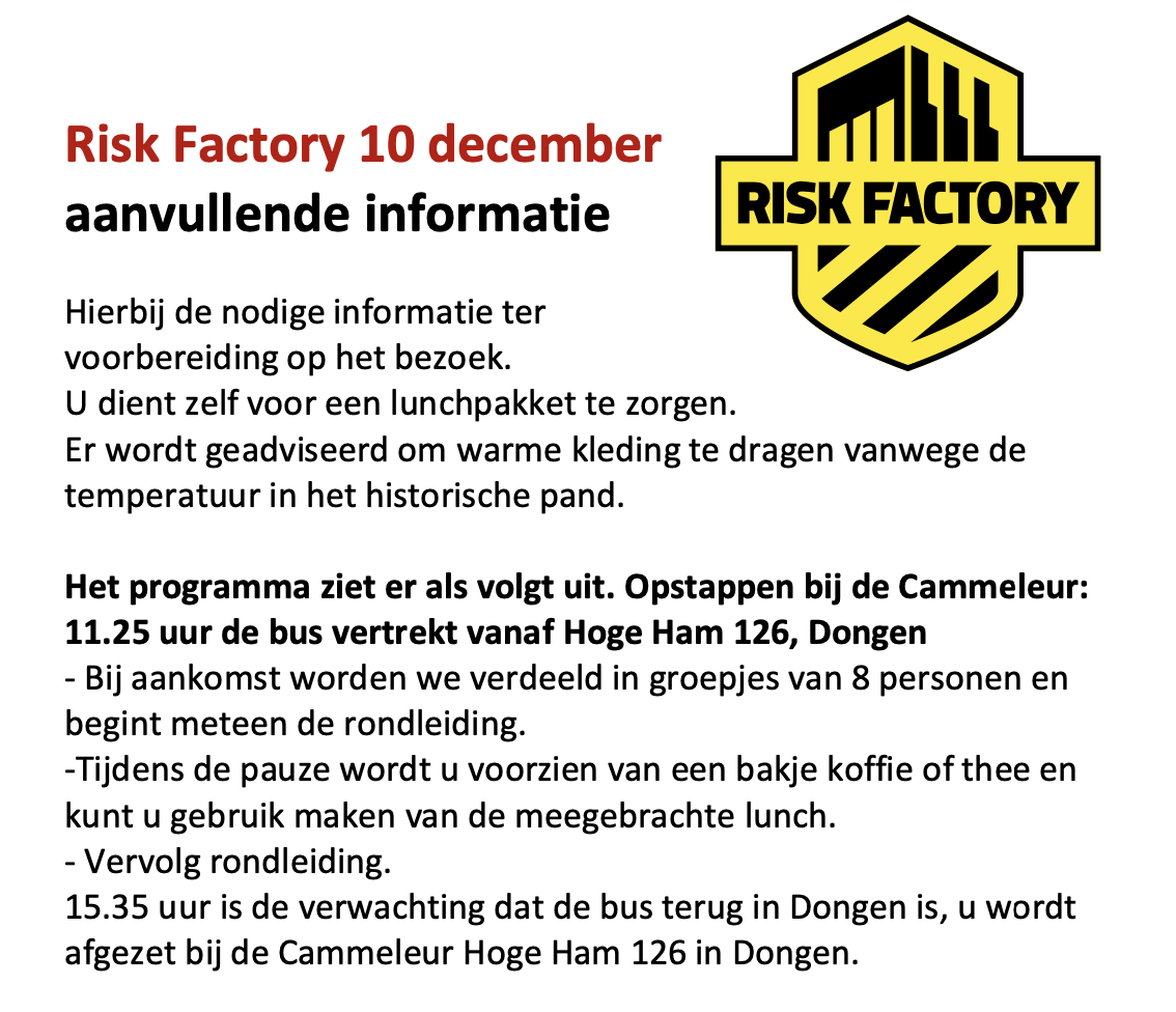 Risk Factory Datum: 10 december 2025 Start om: 11:25 Eindigt om: 15:35 Locatie: Cammeleur Google maps Contactpersoon: Voor meer informatie klik op onderstaande link. Link: https://www.kbo-dongen.nl/files/2025/11/Risk-Factory.png Terug naar kalender